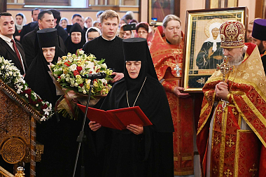 «Хотел бы сердечно поблагодарить Вас, матушка игумения Феофания, за труды, которые Вы вместе с сестрами несете в этой святой обители. Всегда с особым чувством я совершаю здесь Божественную литургию, радуюсь видеть и новых послушниц. Дай Бог, чтобы укреплялась монашеская жизнь, чтобы тропа паломническая никогда не зарастала к великой святыне Церкви нашей – гробу с мощами святой праведной Матроны Московской – и чтобы ее молитвами и ходатайствами пред лицом Божиим Господь хранил всех нас. Аминь», – пожелал в завершение Святейший Владыка.