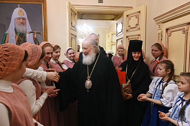 В дар обители Предстоятель Русской Церкви передал пасхальное яйцо с изображением Христа Спасителя. Игумении Феофании Святейший Патриарх вручил юбилейный крест, изготовленный к 10-й годовщине Поместного Собора 2009 года и Патриаршей интронизации Его Святейшества.