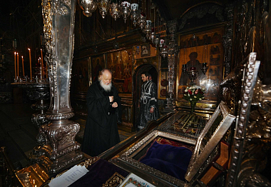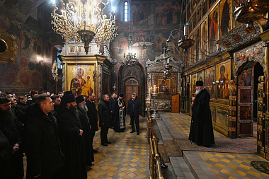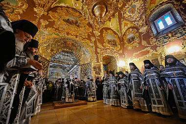 В Троицком соборе Святейший Патриарх Кирилл поклонился честным мощам преподобного Сергия Радонежского и святыням Никоновского придела и Серапионовой палаты.