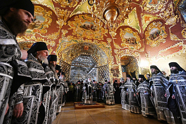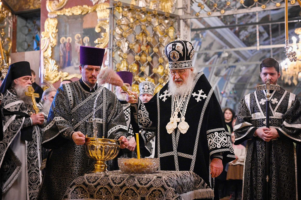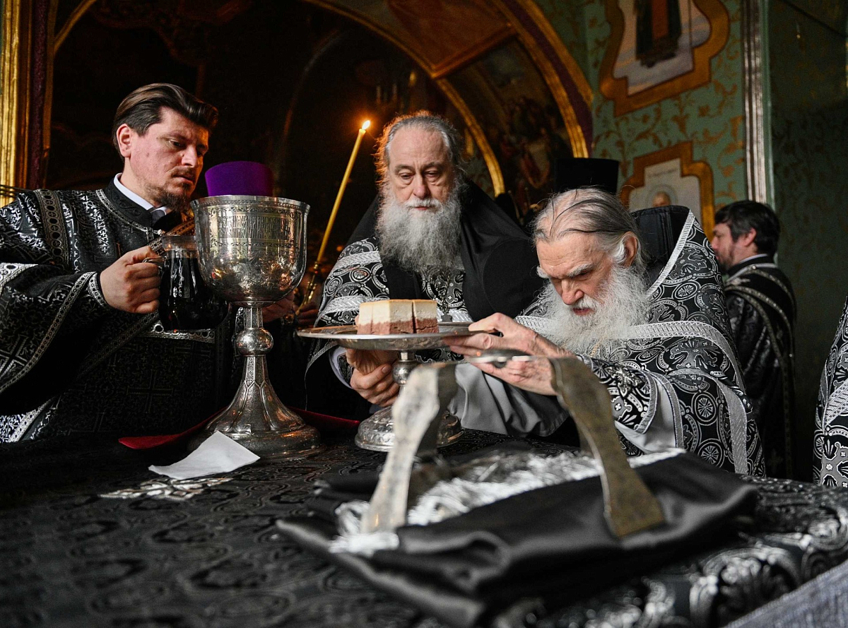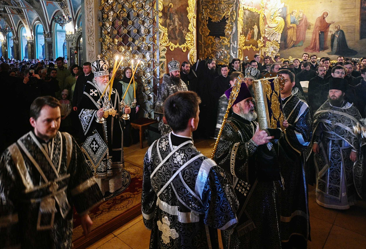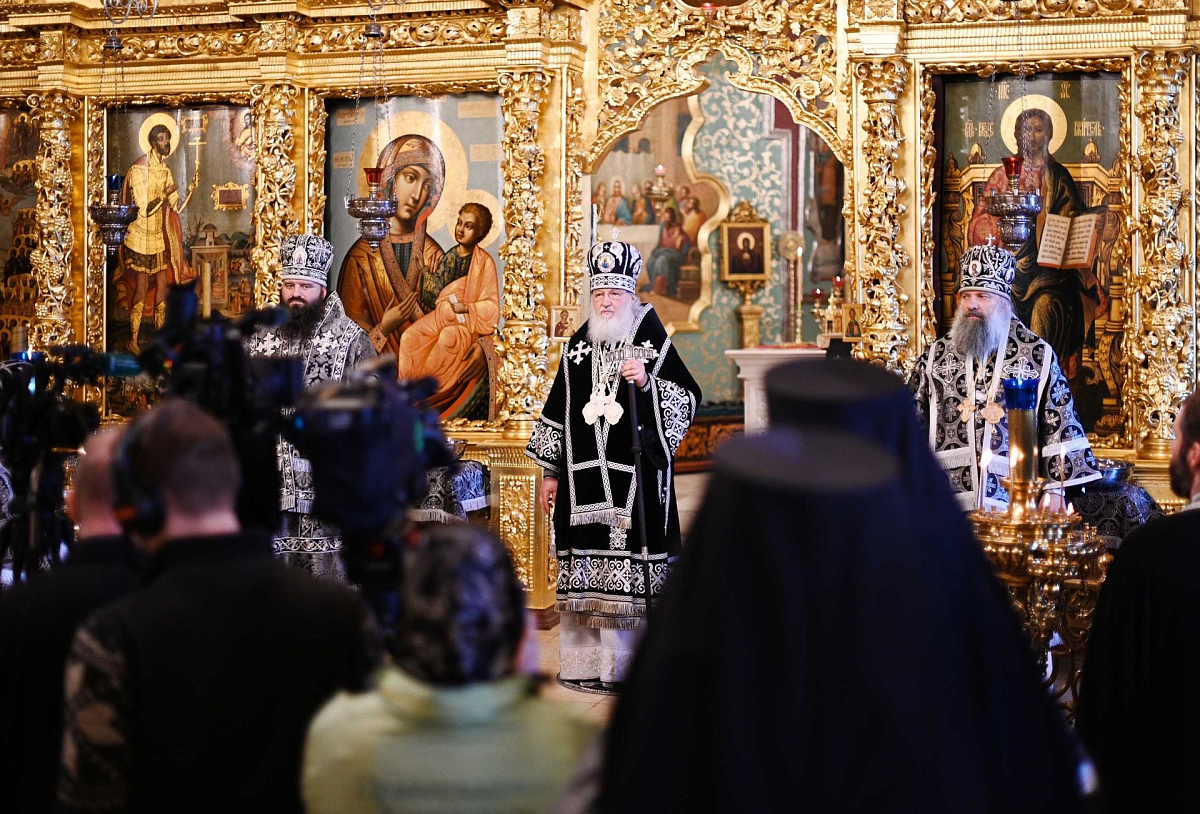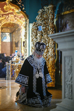 Затем в Трапезном храме в честь преподобного Сергия Радонежского Предстоятель Русской Церкви совершил Литургию Преждеосвященных Даров.