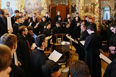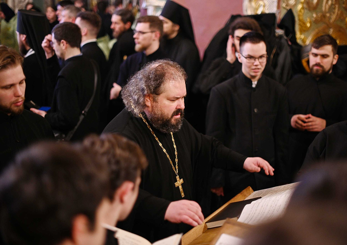 Церковные песнопения исполнили братский хор Троице-Сергиевой лавры под управлением архимандрита Глеба (Кожевникова) и хор Московской духовной академии под управлением иеромонаха Нестора (Волкова).