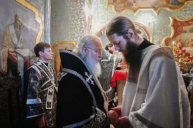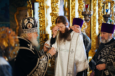 За Литургией Святейший Патриарх Кирилл рукоположил насельника обители монаха Прохора (Злобина) в сан иеродиакона.