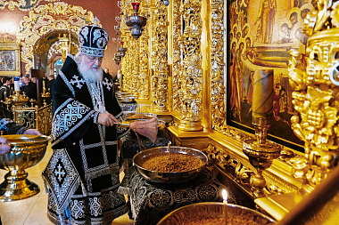По заамвонной молитве Святейший Владыка возглавил молебное пение великомученику Феодору Тирону и благословил коливо.