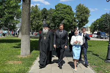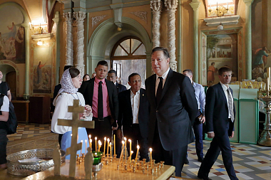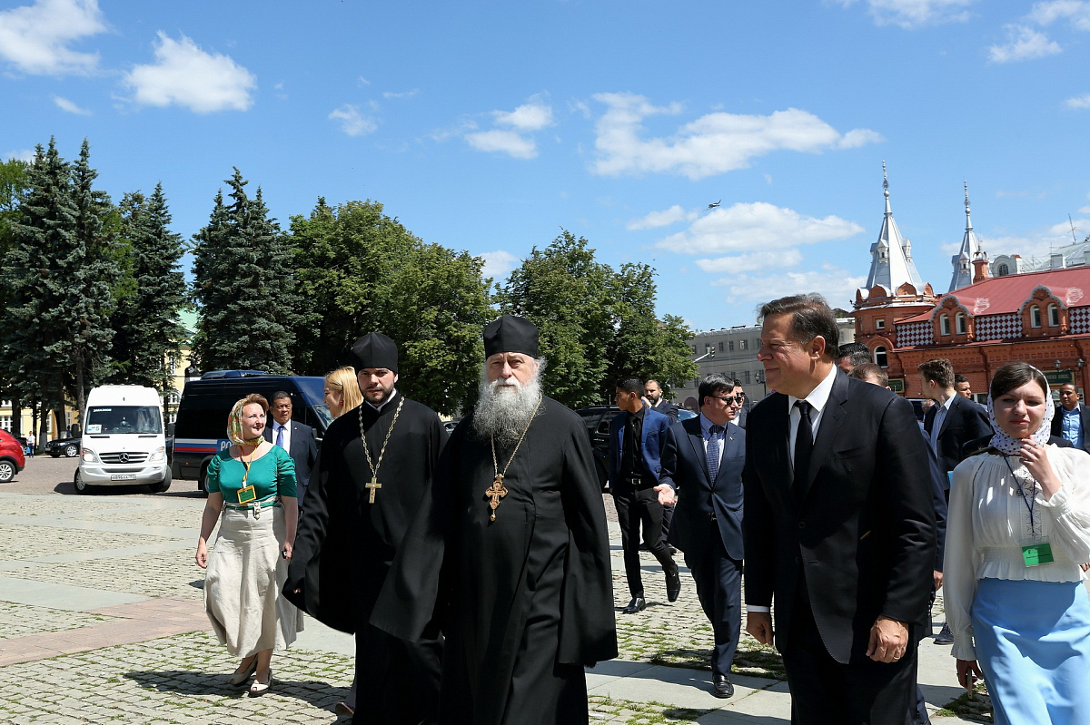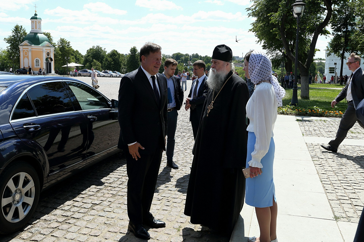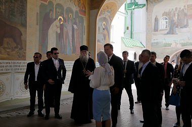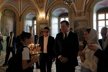 От лица Лавры высокого гостя встречали насельник обители профессор Московской духовной академии архимандрит Макарий (Веретенников) и помощник наместника монастыря по представительской работе иерей Михаил Боданов.