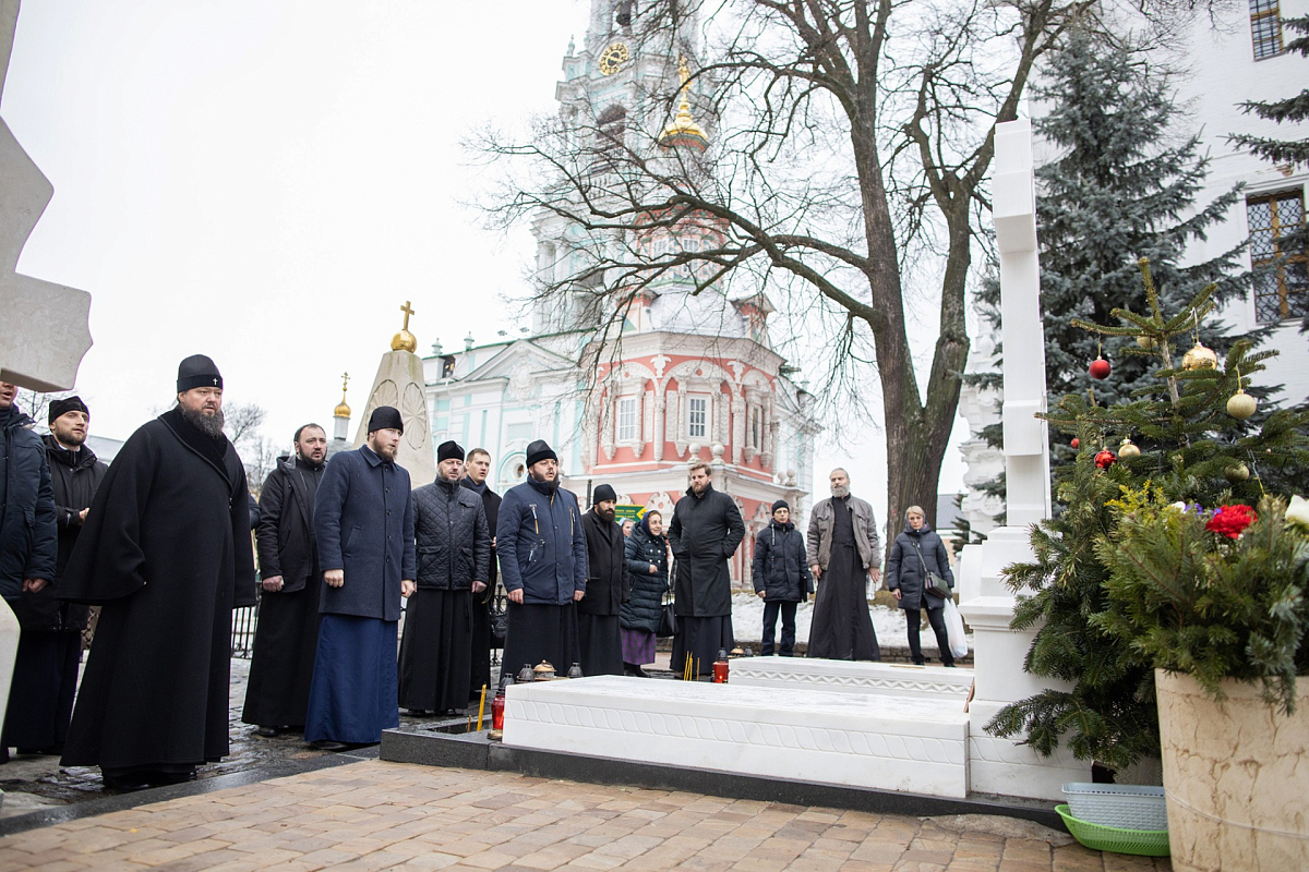 По дороге в Троицкий собор иеродиакон Георгий рассказал об истории Предтеченского и Духовского храмов обители. На некрополе Духовского храма митрополит с клириками приложились к крестам на могилах старцев Лавры архимандритов Кирилла (Павлова) и Наума (Байбородина) и пропели «Вечную память».