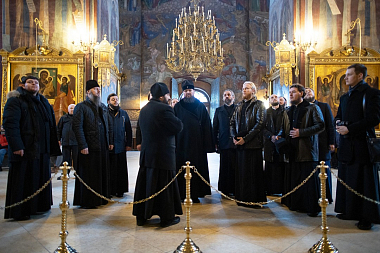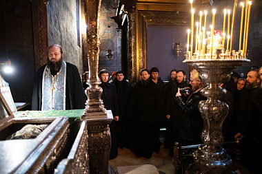 В Троицком соборе гости приложились к мощам преподобного Сергия Радонежского, исполнили величание святому и прошли в Серапионову палату с Никоновским пределом, где иеродиакон Георгий подробно рассказал о собранных в них святынях.
