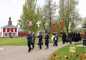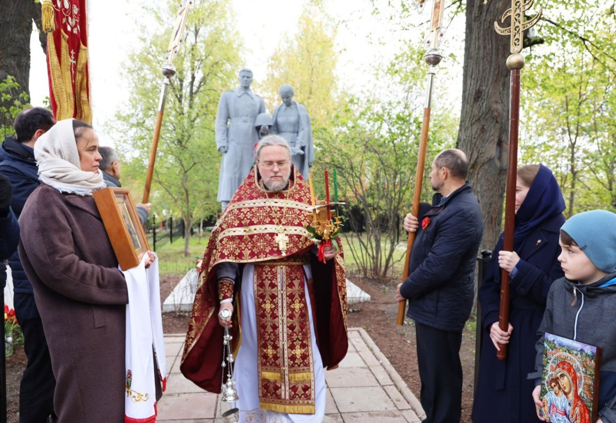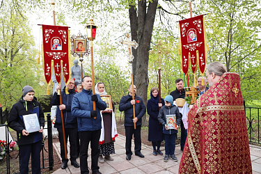 По совершении Литургии был отслужен благодарственный молебен Господу за дарование победы в Великой Отечественной войне. Затем крестным ходом все прошли к памятнику погибшим воинам, расположенному напротив Святых врат обители.