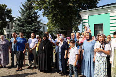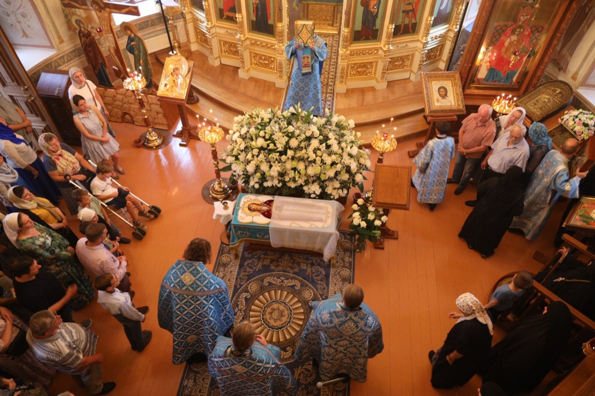 Накануне, 27 августа было отслужено всенощное бдение с выносом Плащаницы Божией Матери. Во время полиелея священники торжественно изнесли драгоценную Плащаницу из алтаря в центр храма и возложили ее на украшенный цветами одр для поклонения верующих. Всю ночь перед Плащаницей читалась Неусыпаемая Псалтирь.