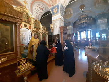 По окончании Литургии иеромонах Адриан поздравил с днем тезоименитства одну из старейших насельниц монастыря монахиню Татиану, вручив ей вынутую за ее здравие просфору и пожелав преодолевать все приходящие трудности и искушения живым действием, не поддаваясь унынию, но принимая их как ступени к совершенству. Игумения Мария (Солодовникова) с сестрами также тепло поздравили именинницу с памятным днем, пожелав ей помощи Божией в прохождении монашеского искуса и поблагодарив за труды, самоотверженно несомые для пользы святой обители.