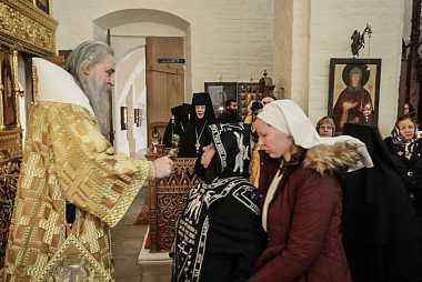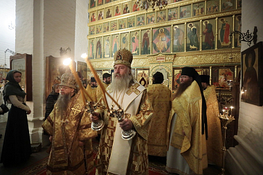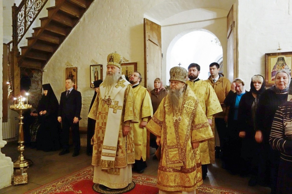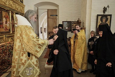 Его Высокопреосвященству сослужили: епископ Солнечногорский Алексий, наместник Данилова ставропигиального мужского монастыря; заместитель председателя Синодального отдела по монастырям и монашеству, настоятель Московского подворья Свято-Троицкой Сергиевой лавры архимандрит Стефан (Тараканов); духовенство обители.
