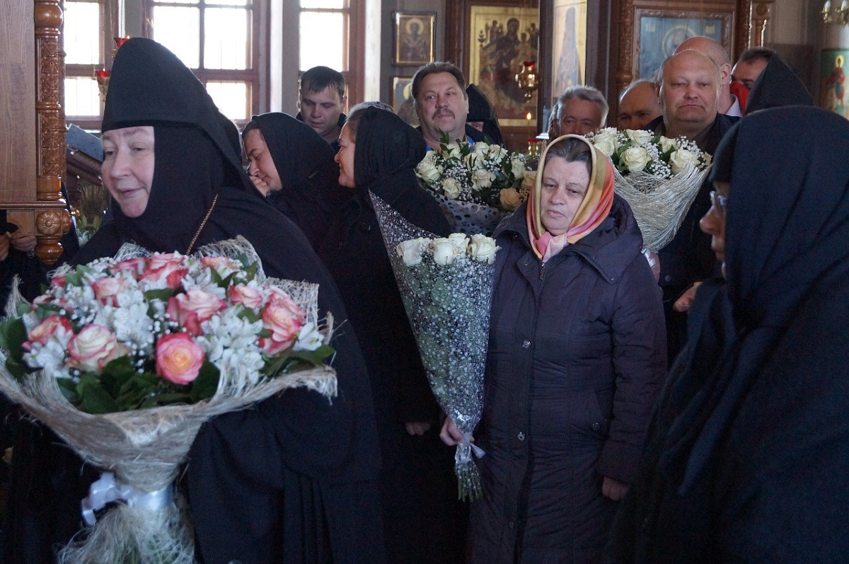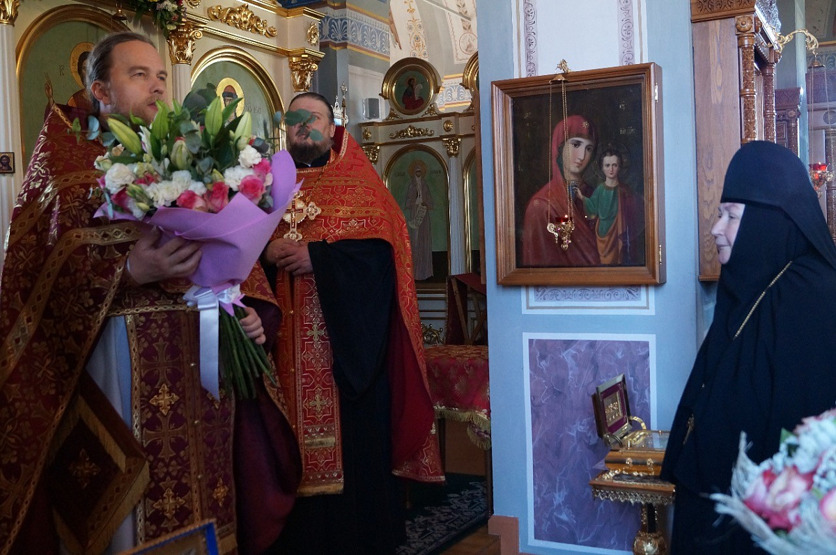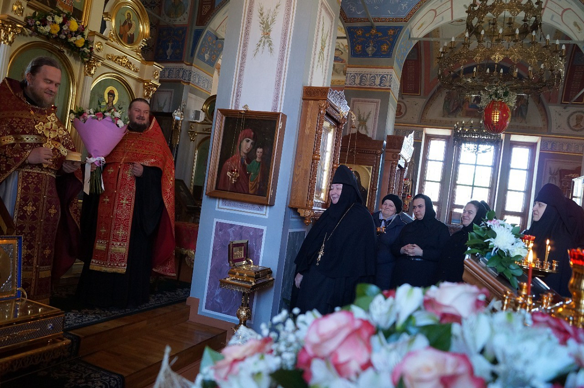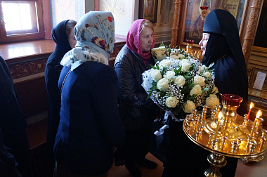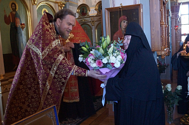 По окончании богослужения игумению Марию от лица духовенства поздравил старший священник монастыря иеромонах Адриан (Чаликов) и преподнес Ее Высокопреподобию в знак непрестанного поминовения настоятельницы обители пред Престолом Божиим богослужебную праздничную просфору и букет цветов, самостоятельно составленный духовенством обители.