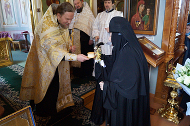 По окончании Литургии от лица духовенства матушку Марию с памятным днем возведения в сан игумении поздравил старший священник обители иеромонах Адриан (Чаликов). С добрыми пожеланиями воодушевления, духовного утешения и радости, укрепления и Божией благодатной помощи в нелегком игуменском служении батюшка преподнес богослужебную просфору в знак молитвенного предстательства о матушке Марии пред Богом.