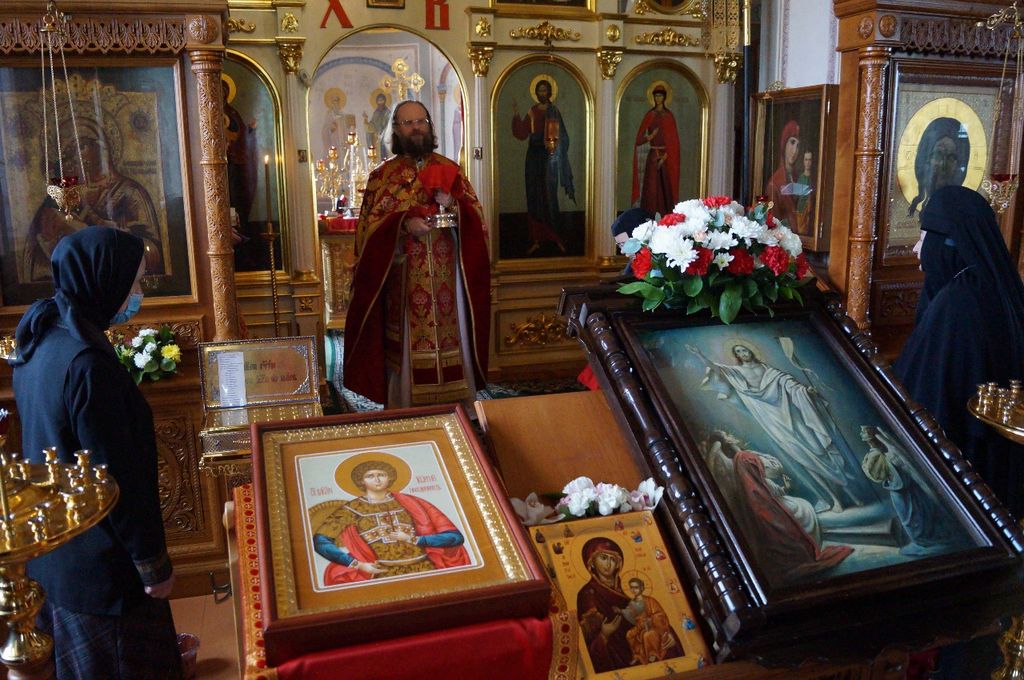 От лица сестер и прихожан, не имевших возможности присутствовать на богослужении в этот праздничный день, тезоименитого пастыря поздравила с благодарностью и искренними пожеланиями настоятельница обители игумения Мария (Солодовникова). Преподнеся батюшке букет цветов, матушка игумения напомнила также о подвиге великомученика Георгия и тех испытаниях, что пришлось ему претерпеть в свое время, и который сейчас своим подвигом укрепляет и воодушевляет нас терпеливо и с благодарностью нести свой жизненный крест, уверяя, что даже в тяжелых испытаниях мы не одни, что мы с Богом, поэтому мы молитвенно просим и сердечно предстоим за всех тех, кто нуждается в поддержке и утешении в это непростое для нас время.