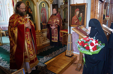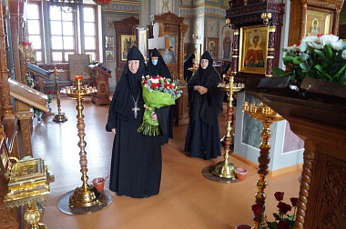От лица духовенства именинника поздравил старший священник обители иеромонах Адриан (Чаликов), преподнеся в знак молитвенного братского предстательства о нем у Престола Божия богослужебную просфору со словами наилучших пожеланий духовного воодушевления, еще большей ревности о Господе в его служении и дальнейшему развитию талантов на благо Церкви Христовой. Также батюшка пожелал собрату «на все дни побеждать, приносить с помощью Божией победу в свою душу и в души тех пасомых, кто своим доверием вручает себя его пастырскому попечению, чтобы от этой победы благодатию Божией рождалась истинная радость, которая, распространяясь за пределы нашей обители посредством общих трудов духовенства обители, матушки игумении с сестрами, исполняла бы слова Писания “с преподобным преподобен будеши…“, чтобы даже люди, далекие от церкви, увидели Свет Христова благовествования через нас, пусть несовершенных, но благодатию Божиею укрепляемых».