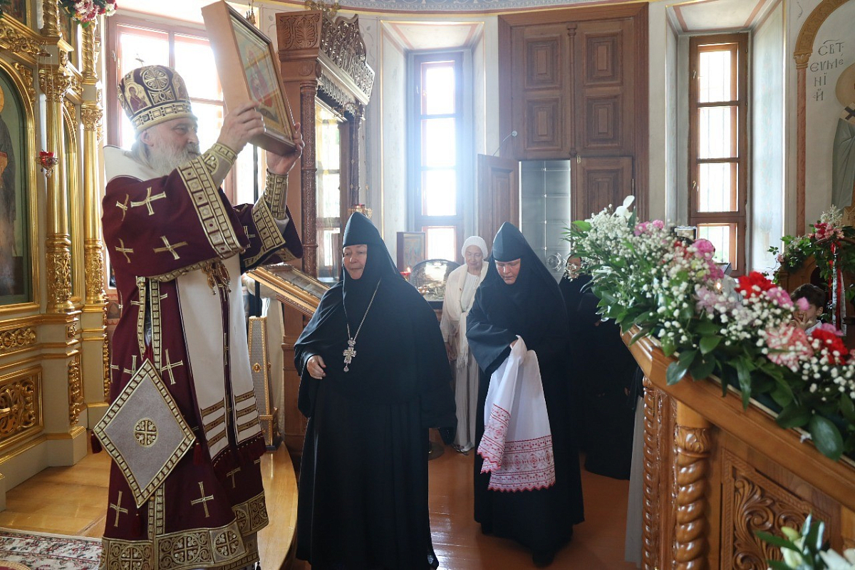 Игумения Мария преподнесла владыке Почаевскую икону Божией Матери, в день которой возобновилась монашеская жизнь в стенах Аносиной обители.