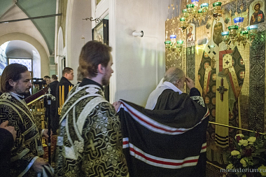 По окончании великого повечерия наместник Высоко-Петровского монастыря игумен Петр (Еремеев) приветствовал Святейшего Владыку и преподнес Его Святейшеству две панагии и крест.