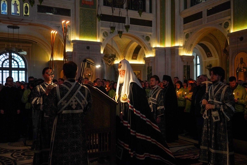 Вечером 21 марта 2024 года, в четверг первой седмицы Великого поста, Святейший Патриарх Московский и всея Руси Кирилл совершил великое повечерие с чтением Великого покаянного канона преподобного Андрея Критского в храме Воскресения Христова и Новомучеников и исповедников Церкви Русской Сретенского ставропигиального мужского монастыря г. Москвы.