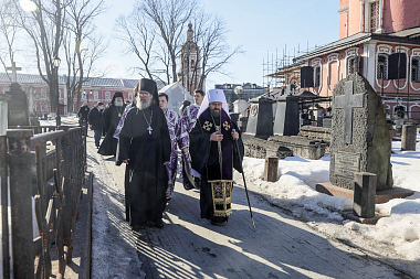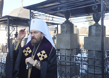 В завершение все проследовали к надгробиям на территории некрополя Донского ставропигиального мужского монастыря, где были погребены греческие иерархи и граждане Греческой республики. Была совершена лития.