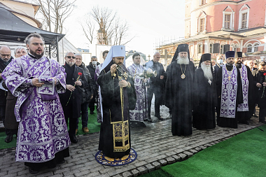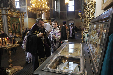 По благословению Святейшего Патриарха Московского и всея Руси Кирилла богослужение возглавил председатель Отдела внешних церковных связей Московского Патриархата митрополит Волоколамский Иларион в сослужении председателя Синодального отдела по монастырям и монашеству, наместника Донского ставропигиального мужского монастыря архиепископа Каширского Феогноста и викария Святейшего Патриарха, наместника Андреевского ставропигиального мужского монастыря епископа Дмитровского Феофилакта.