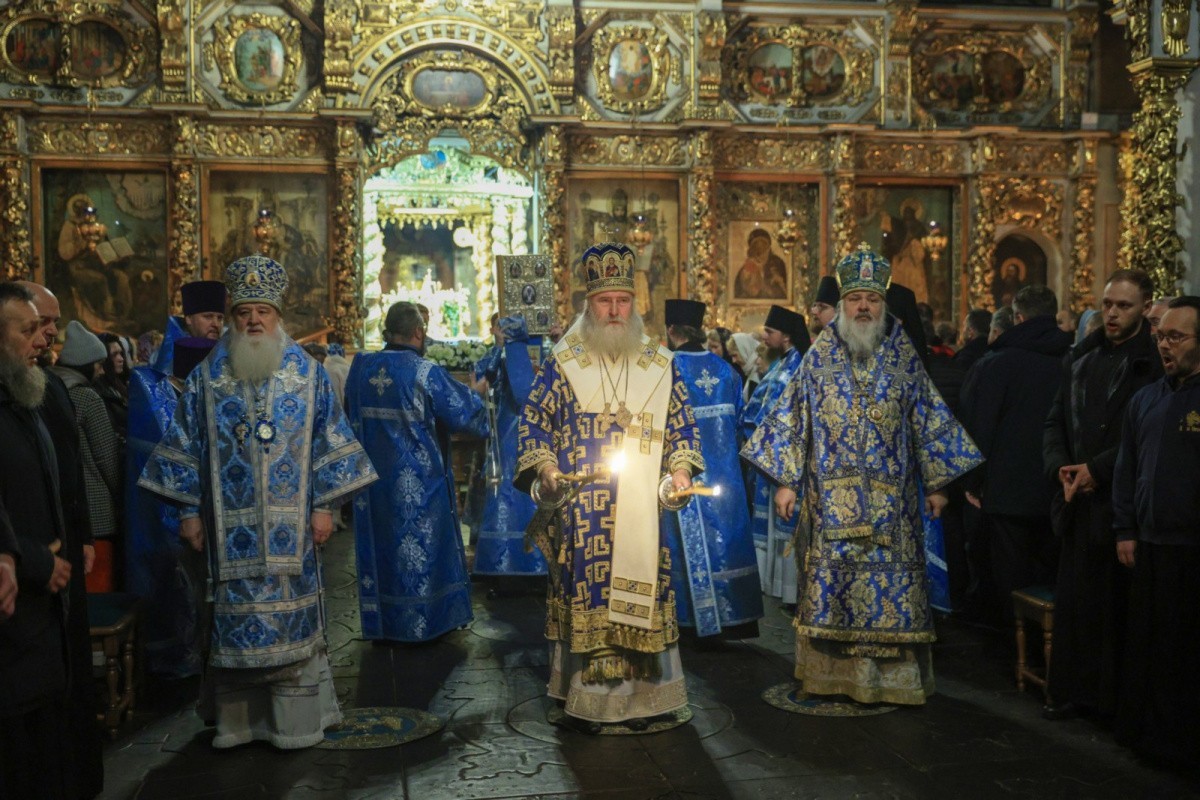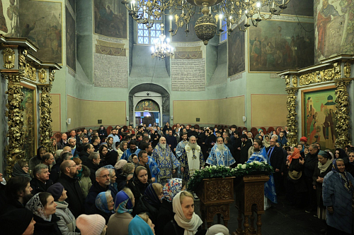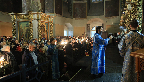 Его Высокопреосвященству сослужили наместник Екатерининского ставропигиального мужского монастыря епископ Видновский Тихон, наместник Высоцкого ставропигиального мужского монастыря епископ Серпуховской Роман, братия обители в священном сане.