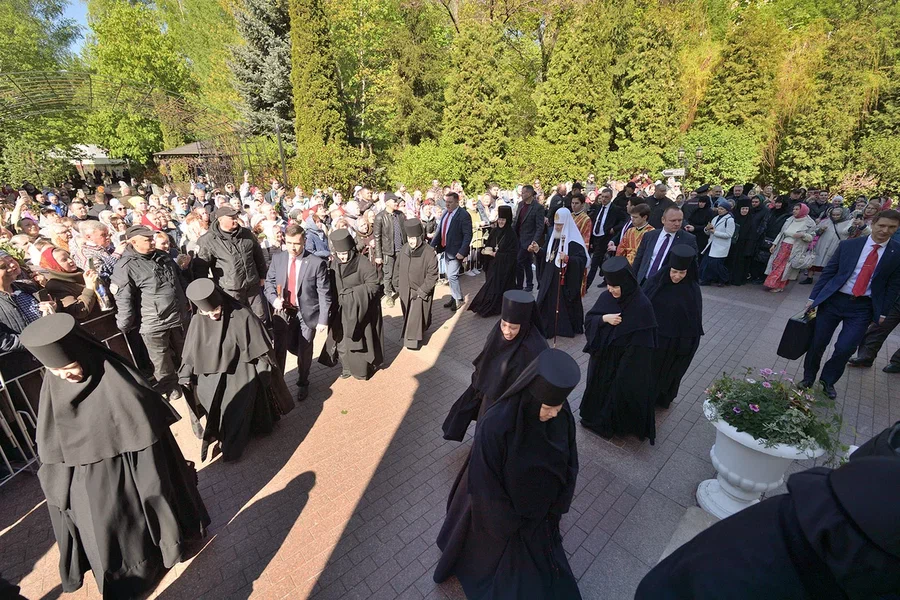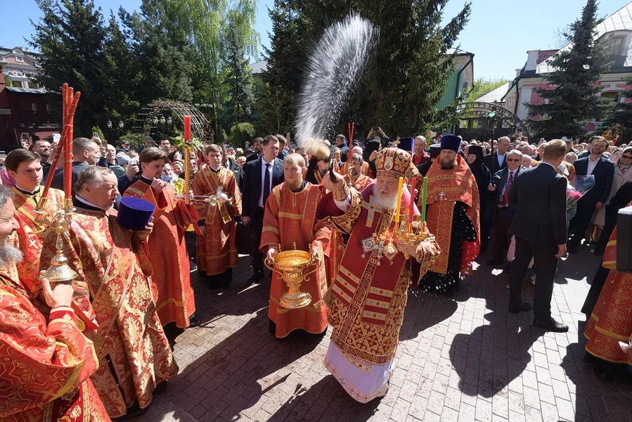 Затем Святейший Патриарх Московский и всея Руси Кирилл возглавил крестный ход вокруг храма Воскресения Словущего. У мощей святой Матроны Предстоятель Русской Церкви совершил славление и молитву.