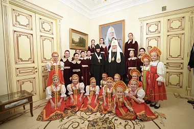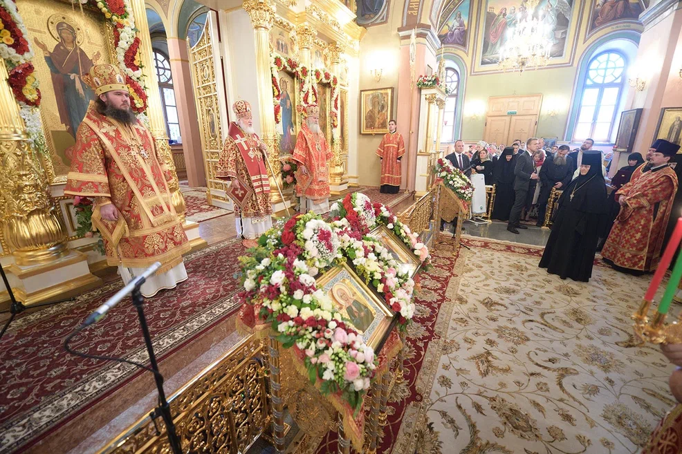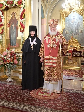 По окончании Литургии игумения Феофания (Мискина) от лица сестер Покровского монастыря и паломников приветствовала Святейшего Владыку и преподнесла Его Святейшеству икону святой Матроны Московской и букет цветов.