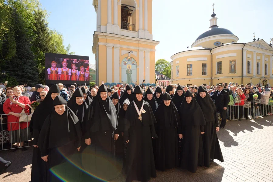 Его Святейшеству сослужили: митрополит Каширский Феогност, председатель Синодального отдела по монастырям и монашеству, наместник Донского монастыря г. Москвы; епископ Сергиево-Посадский и Дмитровский Фома, наместник Свято-Троицкой Сергиевой лавры; архимандрит Алексий (Туриков), личный секретарь Святейшего Патриарха Кирилла; протоиерей Даниил Андреюк, настоятель подворья Православной Церкви в Америке в г. Москве; протоиерей Олег Егоров, благочинный храмов Покровского округа Московской епархии, настоятель храма преподобного Василия исповедника, Патриаршего подворья у Рогожской Заставы г. Москвы; протоиерей Илия Осиевский, клирик Покровского монастыря г. Москвы; протоиерей Феодор Лях, клирик Покровского монастыря г. Москвы; столичное духовенство.