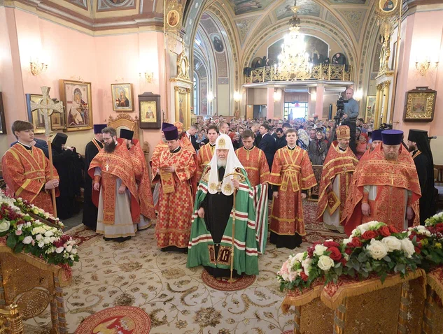 Затем Предстоятель Русской Церкви возглавил служение Божественной литургии в храме Воскресения Словущего.