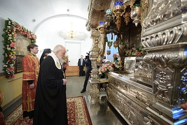 По прибытии в монастырь Святейший Патриарх Кирилл поклонился честным мощам блаженной Матроны, почивающим в храме Покрова Пресвятой Богородицы.