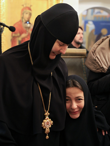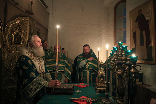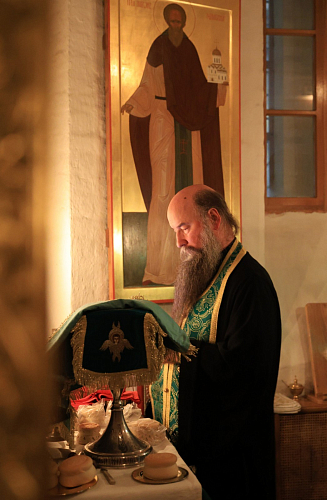 Его Высокопреосвященству сослужили пресс-секретарь Синодального отдела по монастырям и монашеству, настоятель московского подворья Введенского ставропигиального мужского монастыря Оптина пустынь архимандрит Мелхиседек (Артюхин), братия обители в священном сане.