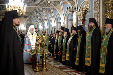 Накануне дня памяти преподобного Никона в Трапезном храме всенощное бдение совершил председатель Синодального отдела по монастырям и монашеству митрополит Каширский Феогност.