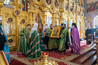 Затем епископ Троицкий Панкратий обратился с приветственным словом к Святейшему Владыке и преподнес в дар Его Святейшеству икону преподобных Сергия и Германа Валаамских.