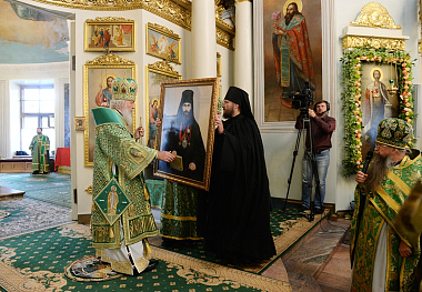 Наместник Данилова монастыря архимандрит Алексий (Поликарпов) приветствовал Святейшего Патриарха Кирилла и преподнес в дар священноархимандриту обители портрет архиепископа Феодора (Поздеевского), который несколько лет был настоятелем монастыря.