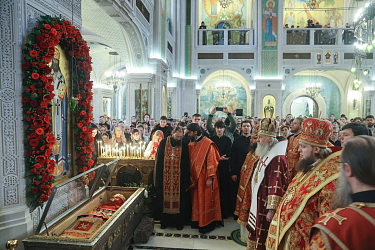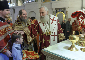 В завершение владыка Феогност поздравил братию и прихожан с днем памяти небесного покровителя обители и передал поздравление Святейшего Патриарха Московского и всея Руси Кирилла наместнику Сретенского монастыря игумену Иоанну (Лудищеву) с 20-летием иерейской хиротонии.