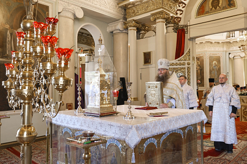 По окончании Литургии архимандрит Стефан (Тараканов) передал епископу Алексию поздравление Святейшего Патриарха Московского и всея Руси Кирилла по случаю дня тезоименитства:
