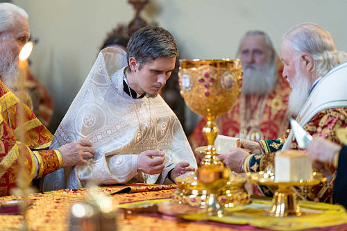 За Литургией Святейший Патриарх Кирилл рукоположил диакона Сергия Конькова, студента I курса магистратуры Московской духовной академии, во пресвитера, и инока Герасима (Куксова), насельника Новоспасского ставропигиального мужского монастыря, во иеродиакона.