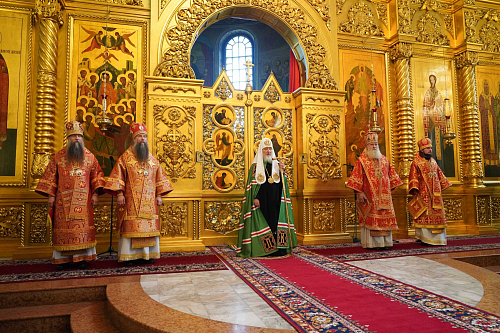 По окончании Литургии было совершено славление празднику, Святейший Владыка прочитал молитву святителю Николаю Чудотворцу.