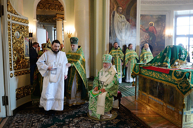По окончании Литургии Святейший Владыка совершил славление и прочитал молитву перед ковчегами с частицами мощей святых благоверных князей Даниила Московского и Александра Невского.