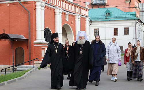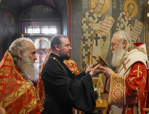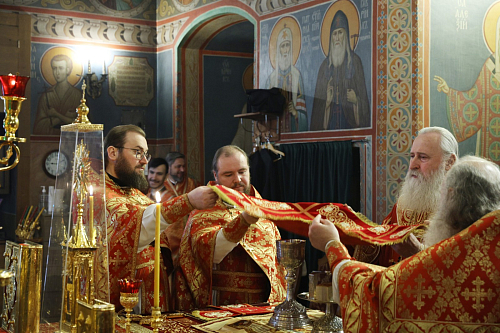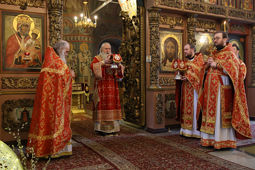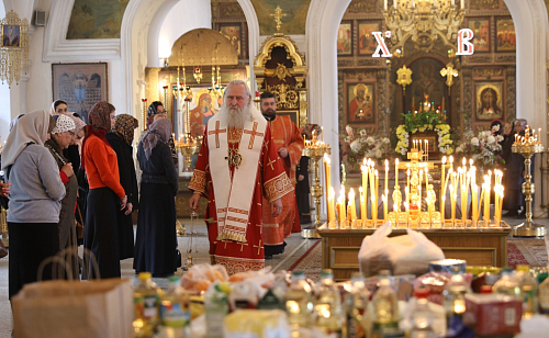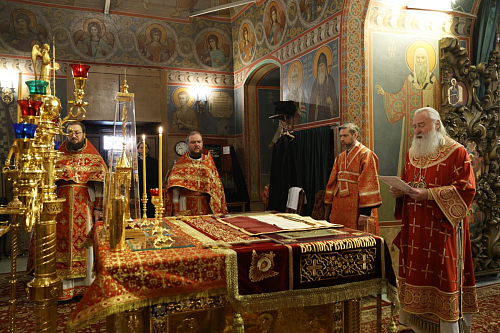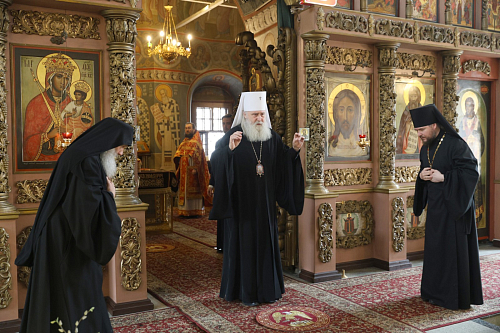 Его Высокопреосвященству сослужили временно исполняющий обязанности наместника священноинок Парфений (Леонов), братия обители в священном сане.