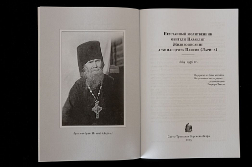 В издательстве Свято-Троицкой Сергиевой лавры вышла книга насельника обители иеромонаха Памфила (Осокина) «Неустанный молитвенник обители Параклит». Она рассказывает о подвижнике прошлых лет, последнем настоятеле лаврского скита Параклит архимандрите Паисии (Ларине; 1869-1956).