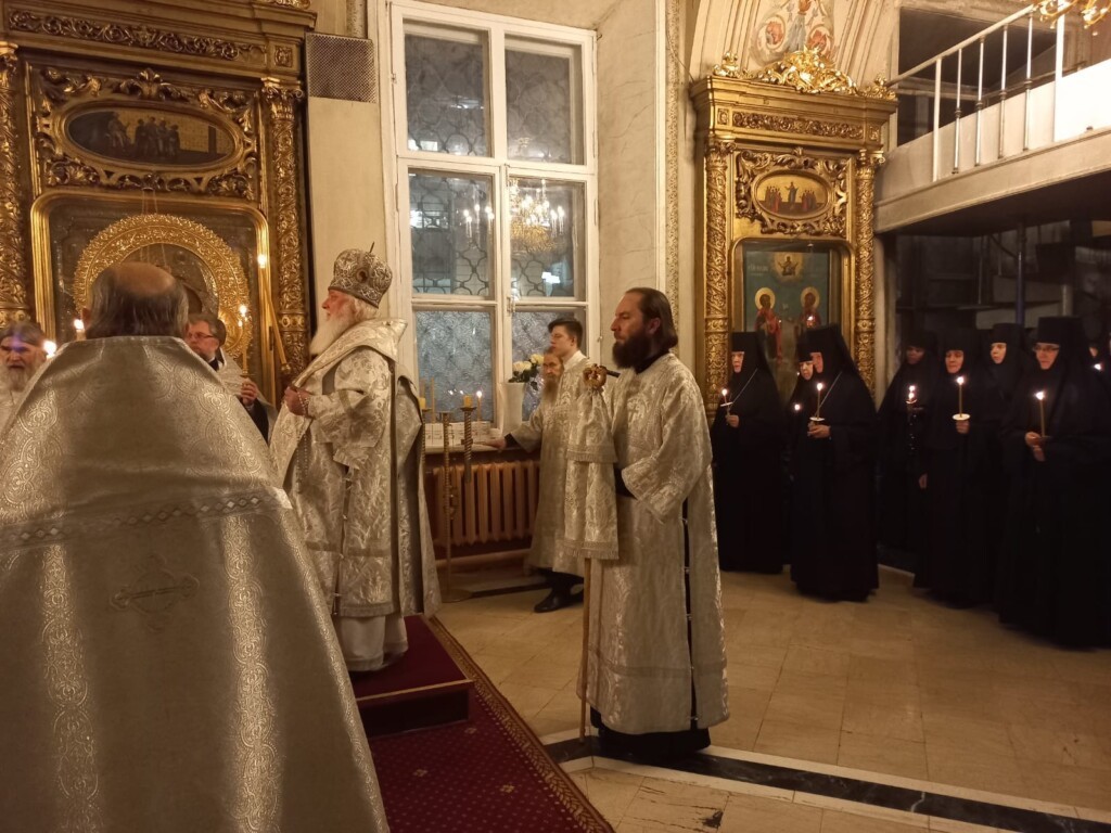 За богослужением молились заместитель председателя Синодального отдела по монастырям и монашествующим, настоятельница Зачатьевского ставропигиального женского монастыря игумения Иулиания (Каледа) с сестрами и настоятельница Богородице-Рождественского монастыря игумения Викторина (Перминова) с сестрами.