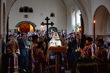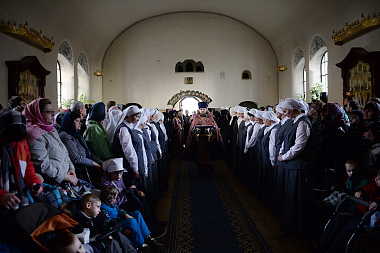 По окончании богослужения настоятельница Марфо-Мариинской обители милосердия игумения Елисавета (Позднякова) приветствовала Святейшего Патриарха Кирилла и преподнесла в дар Его Святейшеству список Феодоровской иконы Божией Матери.