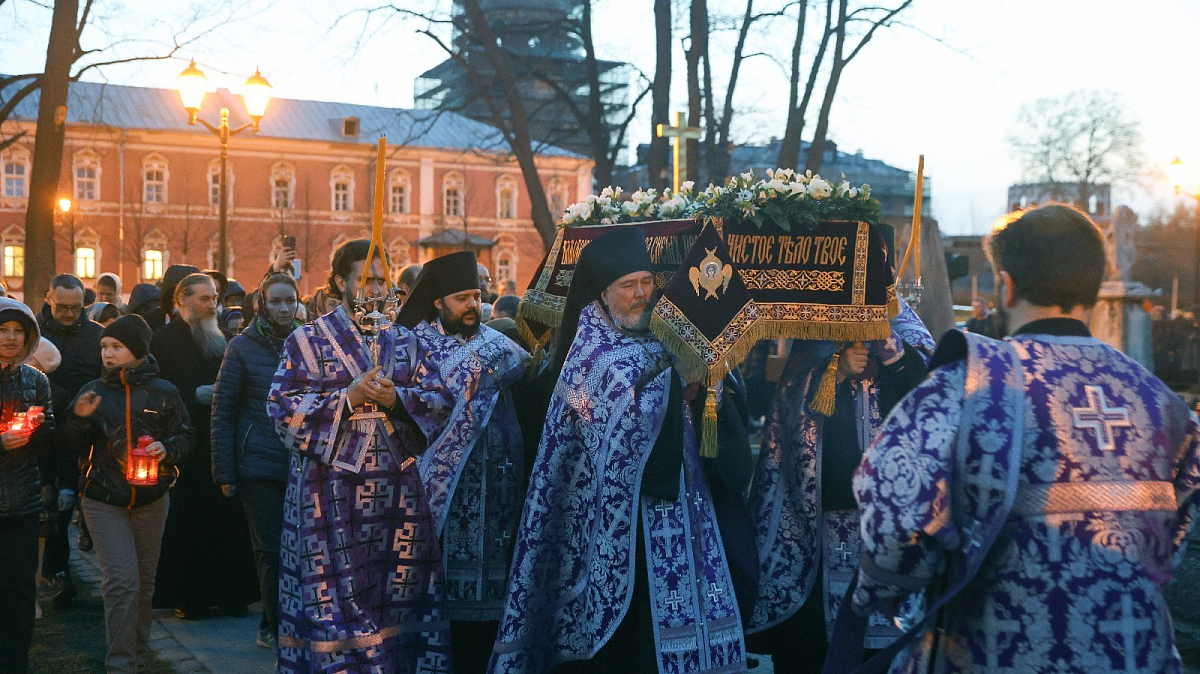 После великого славословия с пением погребального «Святый Боже» был совершен крестный ход вокруг собора с Плащаницей.