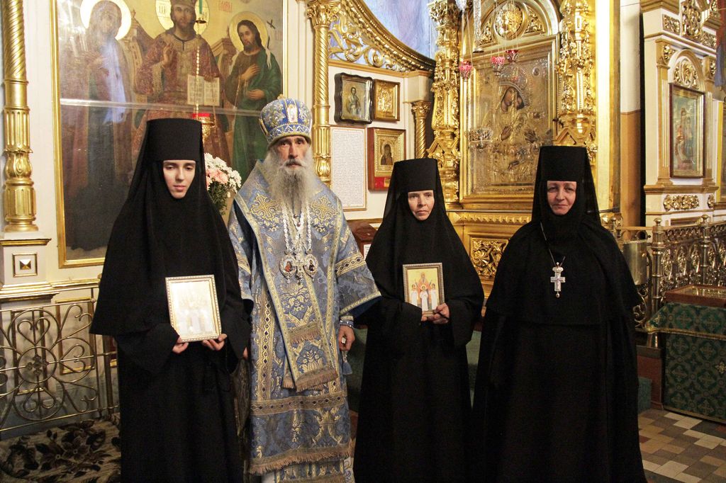 В завершение Высокопреосвященнейший владыка поздравил новопостриженных сестер, произнес для них назидательное слово и вручил памятные подарки – иконы святых мучениц Веры, Надежды, Любови и матери их Софии.