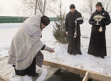 Прихожане вместе с настоятельницей монастыря игуменией Екатериной (Чайниковой) и сестрами обители крестным ходом прошли на приготовленную иордань – монастырский пруд с купальней в честь святого Предтечи и Крестителя Господня Иоанна. На пруду был совершен чин великого освящения воды. Эта вода называется агиасмой, или Крещенской водой. Водоосвящение в Церкви под влиянием Иерусалимского устава происходит два раза: в Крещенский сочельник и сам праздник Богоявления.