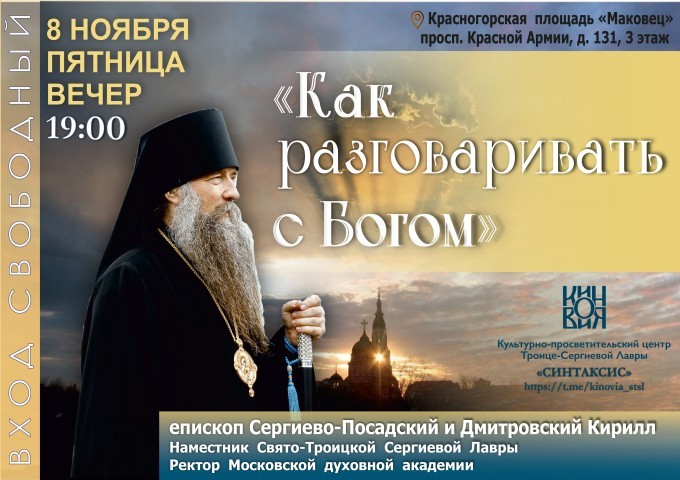 Беседа владыки Кирилла будет посвящена теме «Как разговаривать с Богом» и пройдет по адресу: г. Сергиев Посад, проспект Красной Армии, Красногорская площадь, дом 131, 3-й этаж. Начало в 19:00.