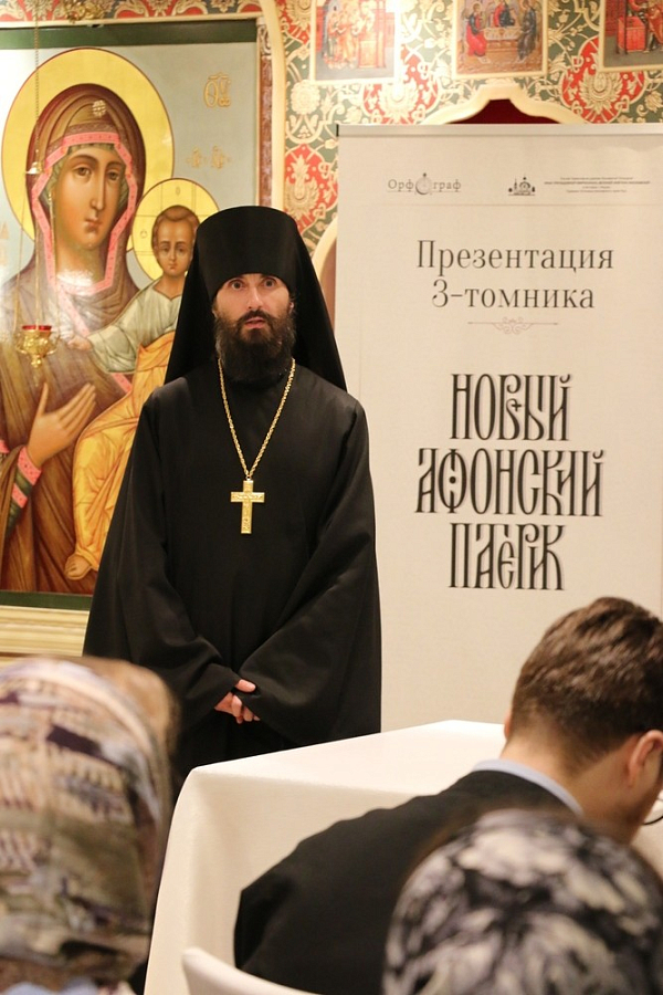 После приветственного слова иеромонаха Клавдиана редактор издательства «Орфограф» иеромонах Пантелеимон рассказал о книге. Рассказ он начал издалека, с изъяснения того, что такое «патерик», и о том, насколько нам важно не только знать заповеди, но и видеть конкретные примеры их исполнения. Примеры, собранные в «Новом Афонском патерике», относятся к новейшему времени – концу XIX, всему XX и началу XXI веков.