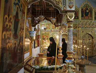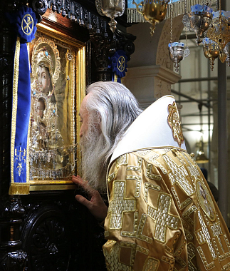По окончании Литургии владыка Феогност совершил славление образу Божией Матери «Милостивая», чтимой святыне Зачатьевской обители, и прочитал перед ним молитву.