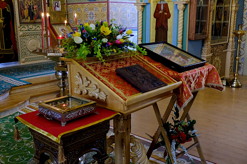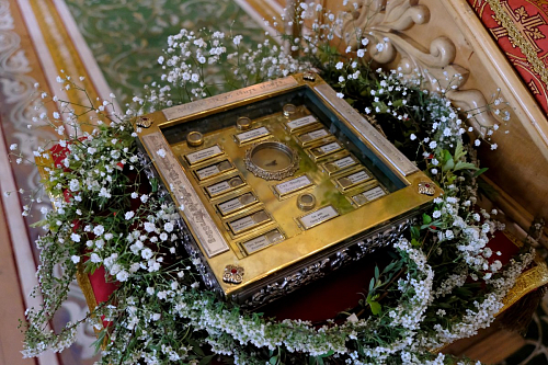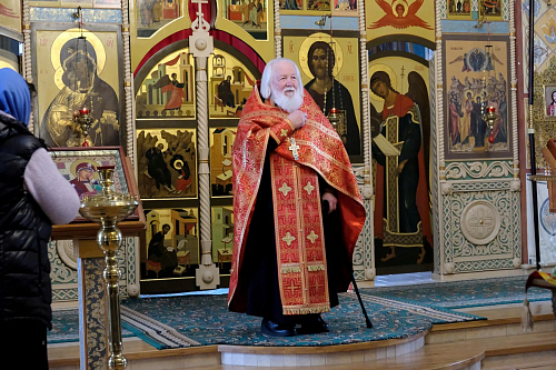 Церемонию передачи святыни предварил торжественный молебен с акафистом перед ковчегом с частицей мощей, по окончании которого к собравшимся с пастырским словом обратился протоиерей Владимир Постников.