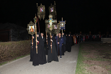 С наступлением полуночи под пение стихиры «Воскресение Твое, Христе Спасе…» молящиеся совершили крестный ход, символизирующий шествие Церкви навстречу Воскресшему Спасителю.